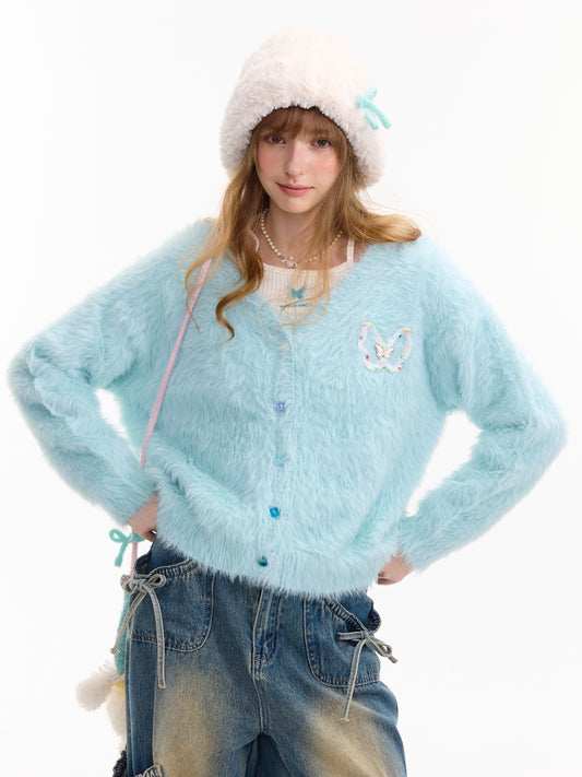 ziziFei - Y2K Soft Plush Butterfly Cardigan with Color Buttons