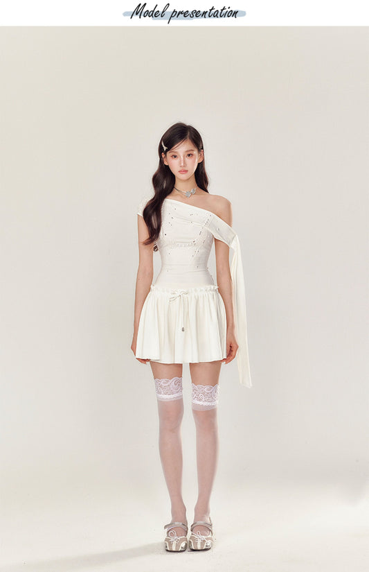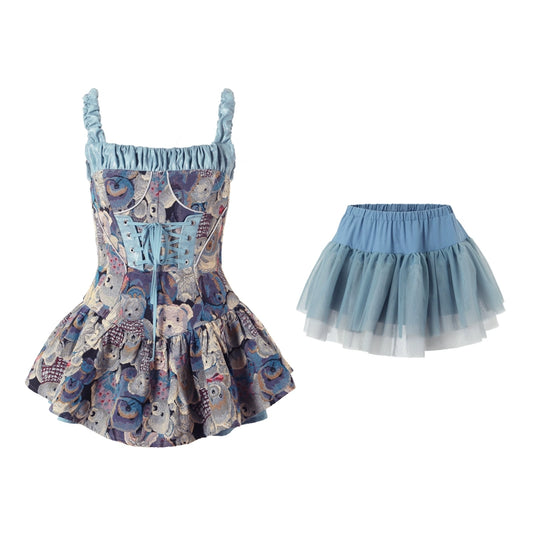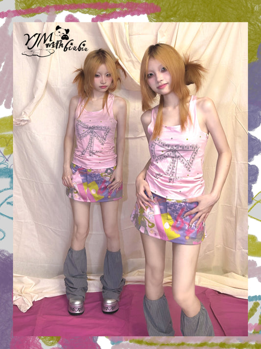 YZZI HE Cherry Top Print Dopamine Layered Pompom Skirt & Top Set