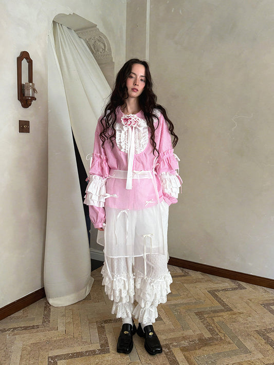 Harajuku Skirt Irregular Pink Skirt Plaid Lace Patchwork Long Skirt