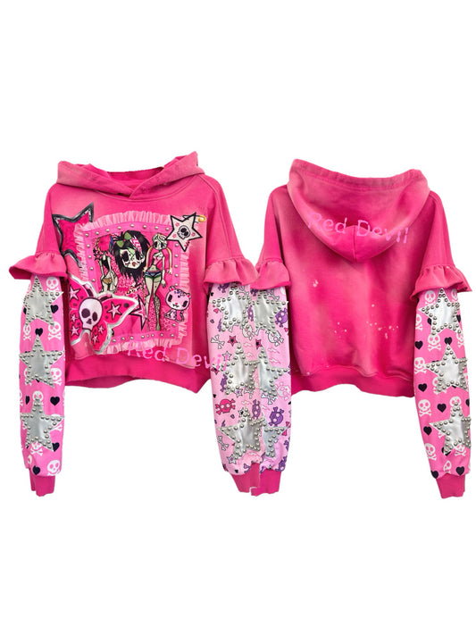 Red Devil Hoodie Decora Kei Hoodie Pink Distressed Hood Ruffle Sleeve Sweatshirt