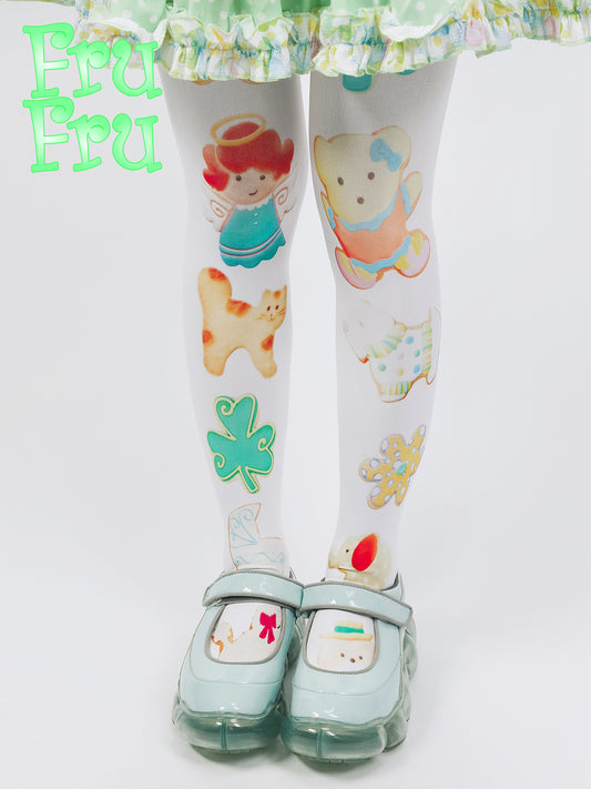 frufru Harajuku White Tights | Cookie Print Cute Stretchy Tights | 100% Cotton
