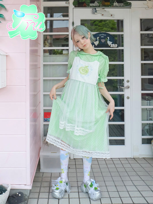 FruFru Summer Doll Collar Dress | Green Polka Dot Dress | Cotton Sleeveless Dress