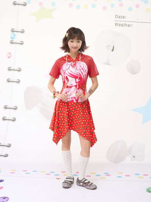 FRUITS Red Cherry Hoodie Dress | Cherry Dot Print & Mesh Sleeve Dress