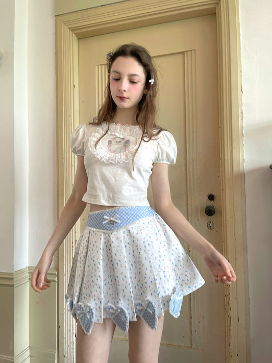 Harajuku T-shirt Angel Cat T-shirt Heart Lace Tee Puff Sleeve T-shirt