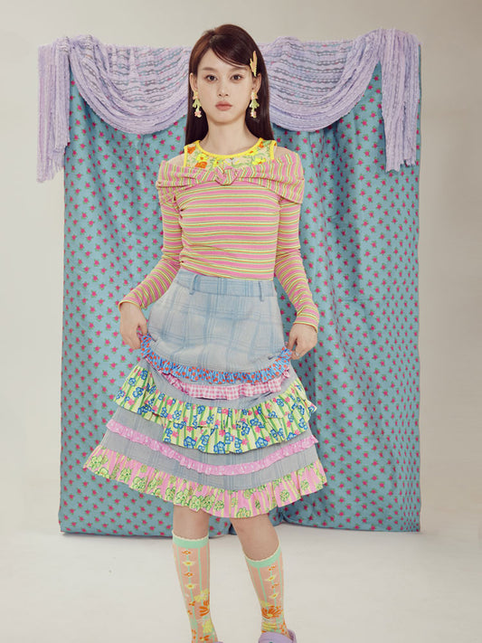 FRUITS Patch‑Work Skirt | Plaid Asymmetric Skirt | Blue Purple Skirt