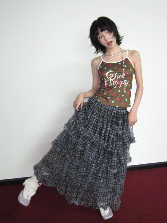 OurHappy Star Plaid Skirt | Layered Mesh Skirt | Maxi Pettiskirt