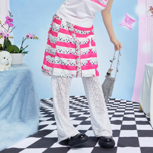 Meugler Dog Show Pink Pearl Puppy Print Wavy Mesh Lace Skirt
