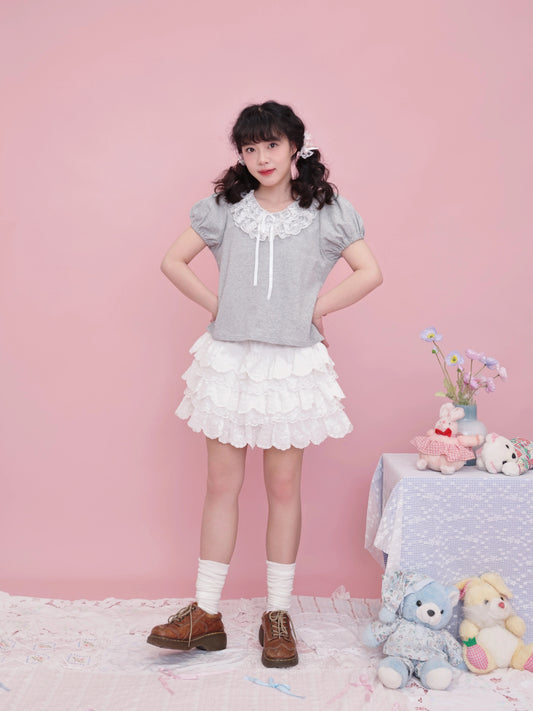 SemenCoicis Vintage Ruffle Collar Tee | Kawaii Puff Sleeve Cotton Top