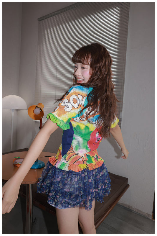 YJM with biubiu "Sunset Blues" Graffiti Bow Slim Top – Harajuku Fitted Tee