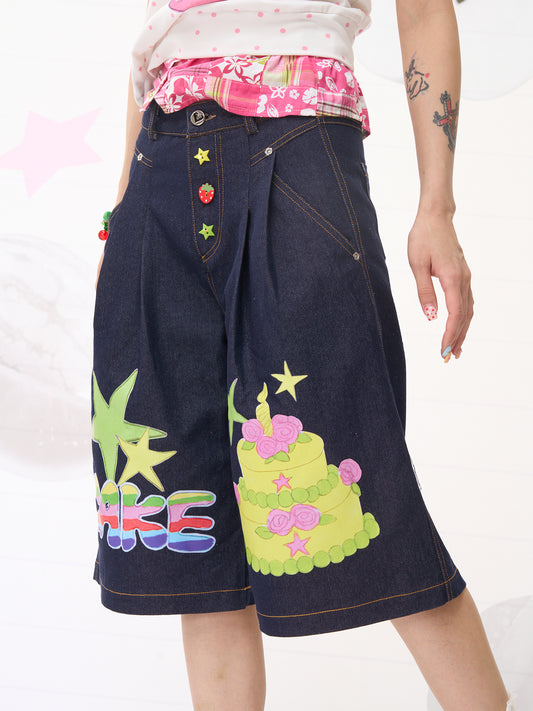 FRUITS Fun Cake Star Print Pants | Wide-Leg Denim Shorts