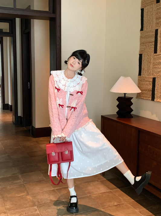 Mameya - Kawaii Bunny Knit Cardigan Pink Bow Cable Sleeve Design