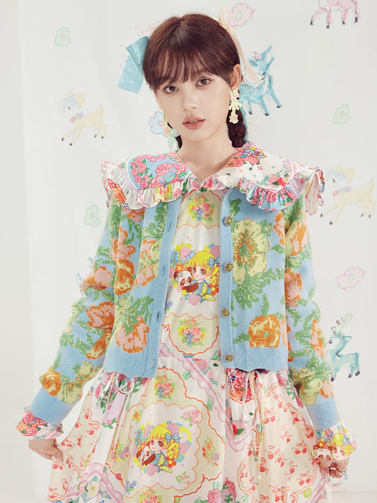 tntntutu Blue Floral Knit Cardigan | Vintage Loose Sweater | Soft Short Knitwear
