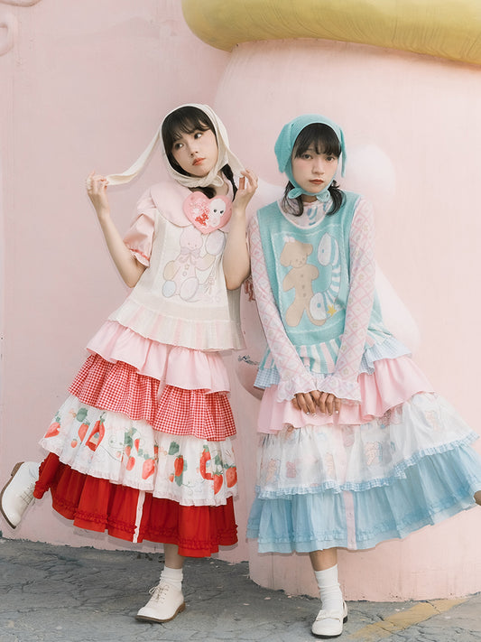YZZI HE Cherry Top Print Dopamine Layered Pompom Skirt & Top Set
