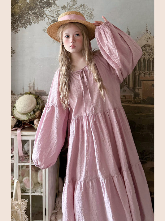 Labeau - Kawaii Polka Dot Tie Waist Puff Sleeve Midi Dress
