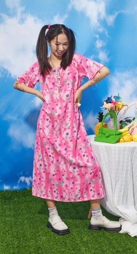 Harajuku Dress Rose Pink Loose Dress Print Cute Vintage Dress
