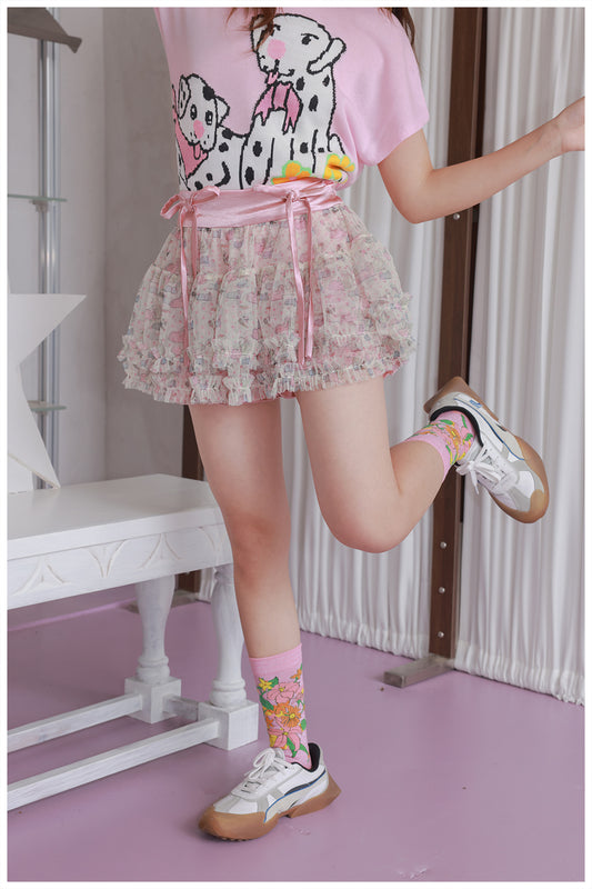 tntntutu Sweet Dog Print Puffy Tulle Skirt Shorts - Bow Waistband Decora Y2K Shorts