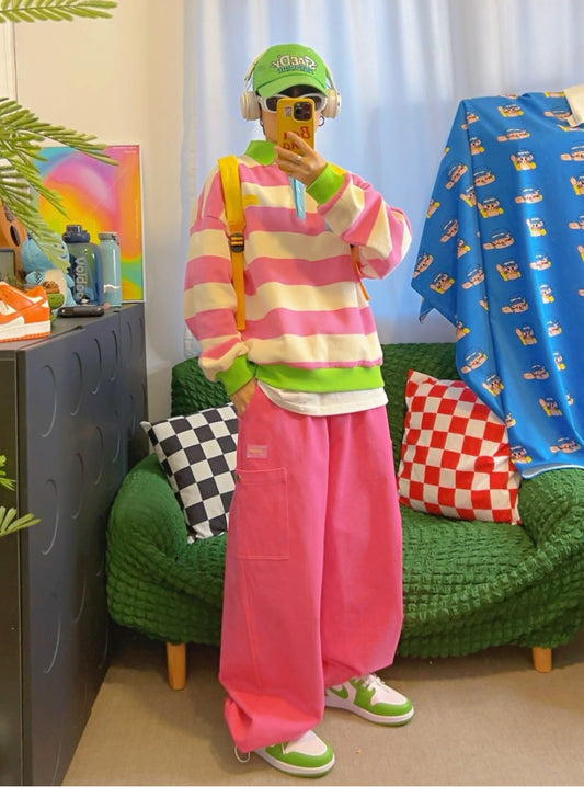 KURIOSITAET - Decora Kei Pink Striped Polo Sweatshirt