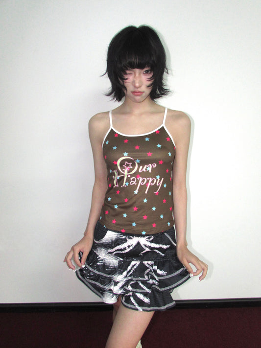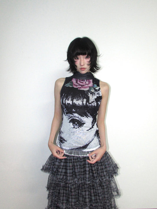 OurHappy Manga Girl Top | Double-Layer Mesh Sleeveless Top | Black & White High-Neck Vest
