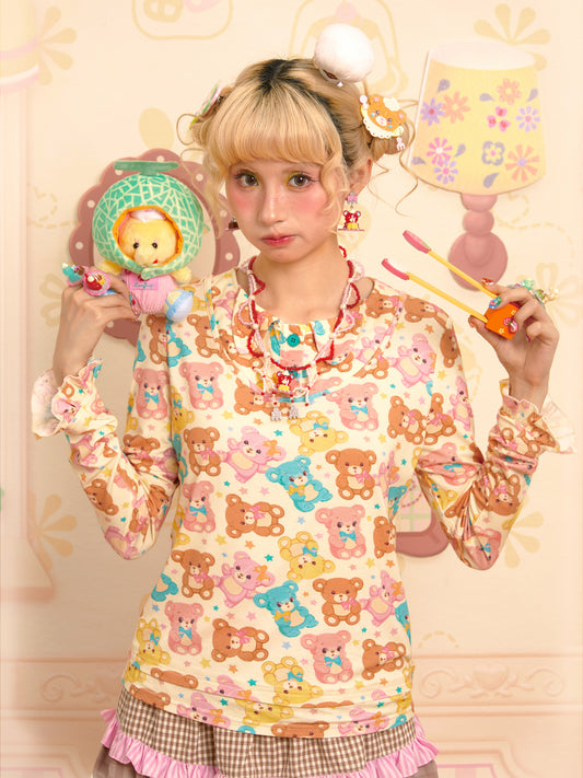 Lutra Jump - Decora Kei Bear Print Layered Long Sleeve Top