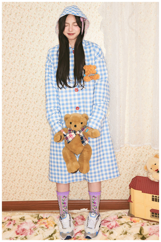 tntntutu - Blue Plaid Hooded Trench Coat w/ Bear Brooch