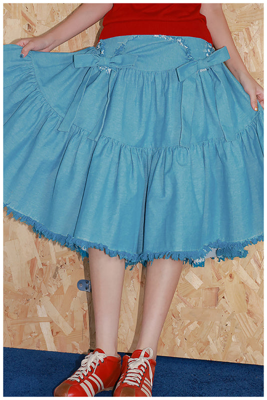 Tntntutu - Kawaii Blue Denim Bow Tassel Layered Skirt