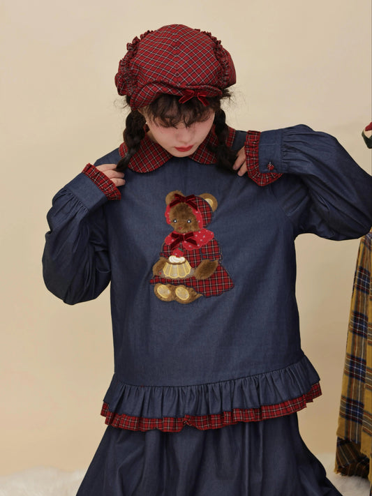 SemenCoicis - Kawaii Denim Shirt Plaid Lace Pudding Bear