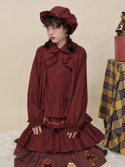 SemenCoicis - Kawaii Blouse Red Plaid Lace Bow Loose Fit