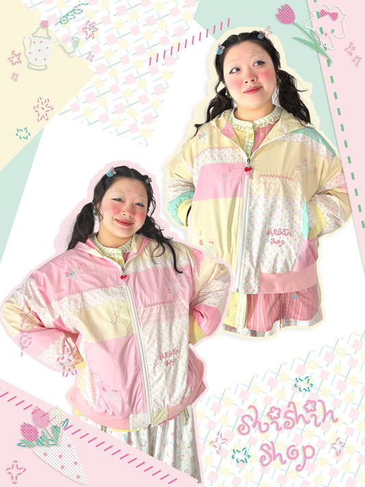 shishihshop Strawberry Hooded Jacket | Embroidered Patchwork Zip-Up Windbreaker