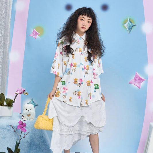 Harajuku Shirt White Dog Print Shirt Cute Summer Short Sleeve Shirt