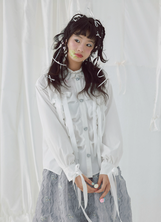Harajuku Shirt Bow Ribbon Shirt Pleated Shirt Cute Metal Button Shirt