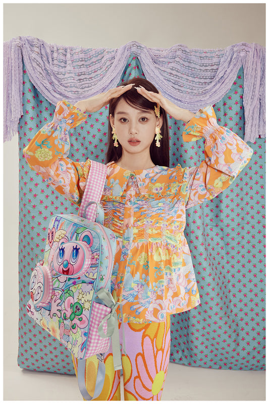 Harajuku Shirt Orange Angel Shirt Cute Cartoon Shirt Ruffled Print Shirt