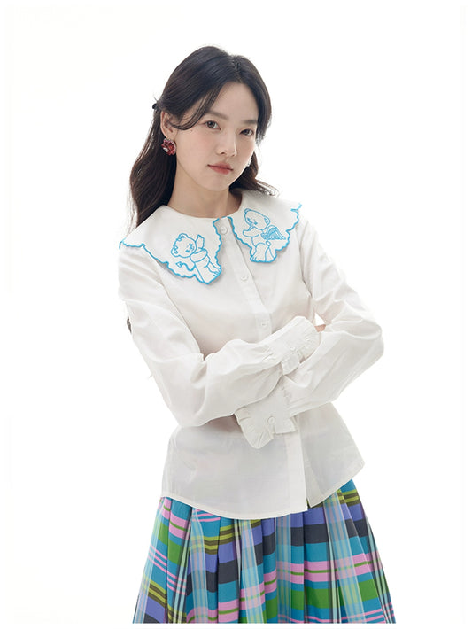 Harajuku Shirt Cartoon Bear Shirt Embroidered Shirt Lace Collar Shirt White Shirt