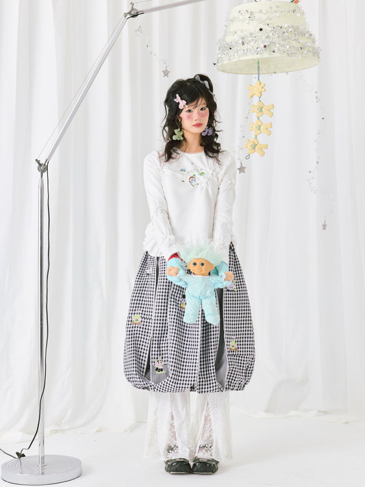 Harajuku T-shirt White Cotton Ruffled Lace Colorful Graffiti Print Long Sleeve T-Shirt
