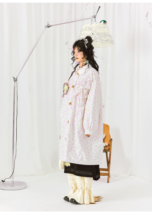 Harajuku Trench Coat Small Floral Print Peter Pan Collar Long Sleeve Trench Coat