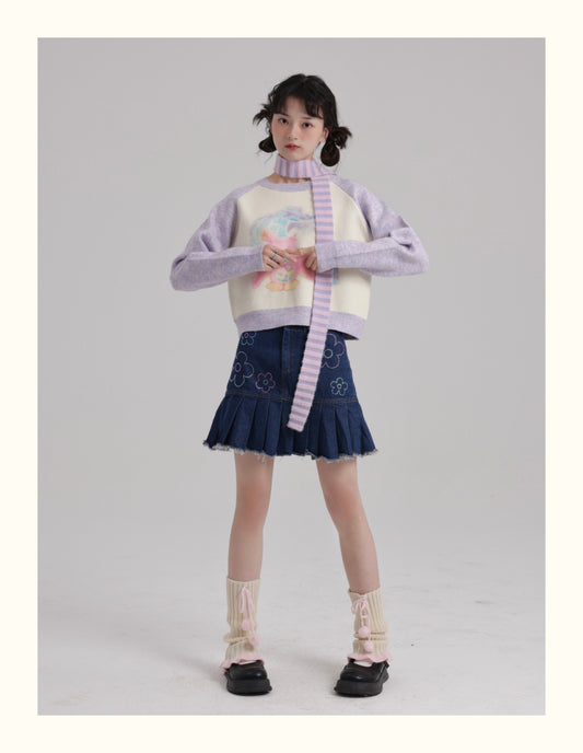 Harajuku Sweater Color-Block Sweater Cute Print Sweater Raglan Sleeve Scarf Sweater