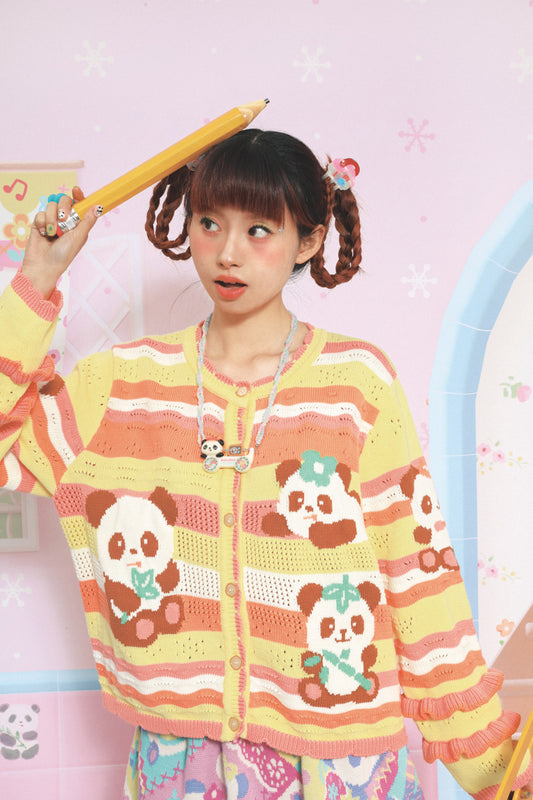 Lutra Jump Cardigan Striped Panda Cardigan Hollow Lace Knit Sweater