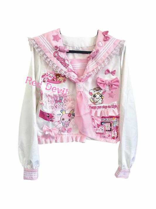 RedDevil Pink Hoodie Decora Handmade Hoodie Cartoon Patchwork Hoodie Rabbit Ear Hoodie