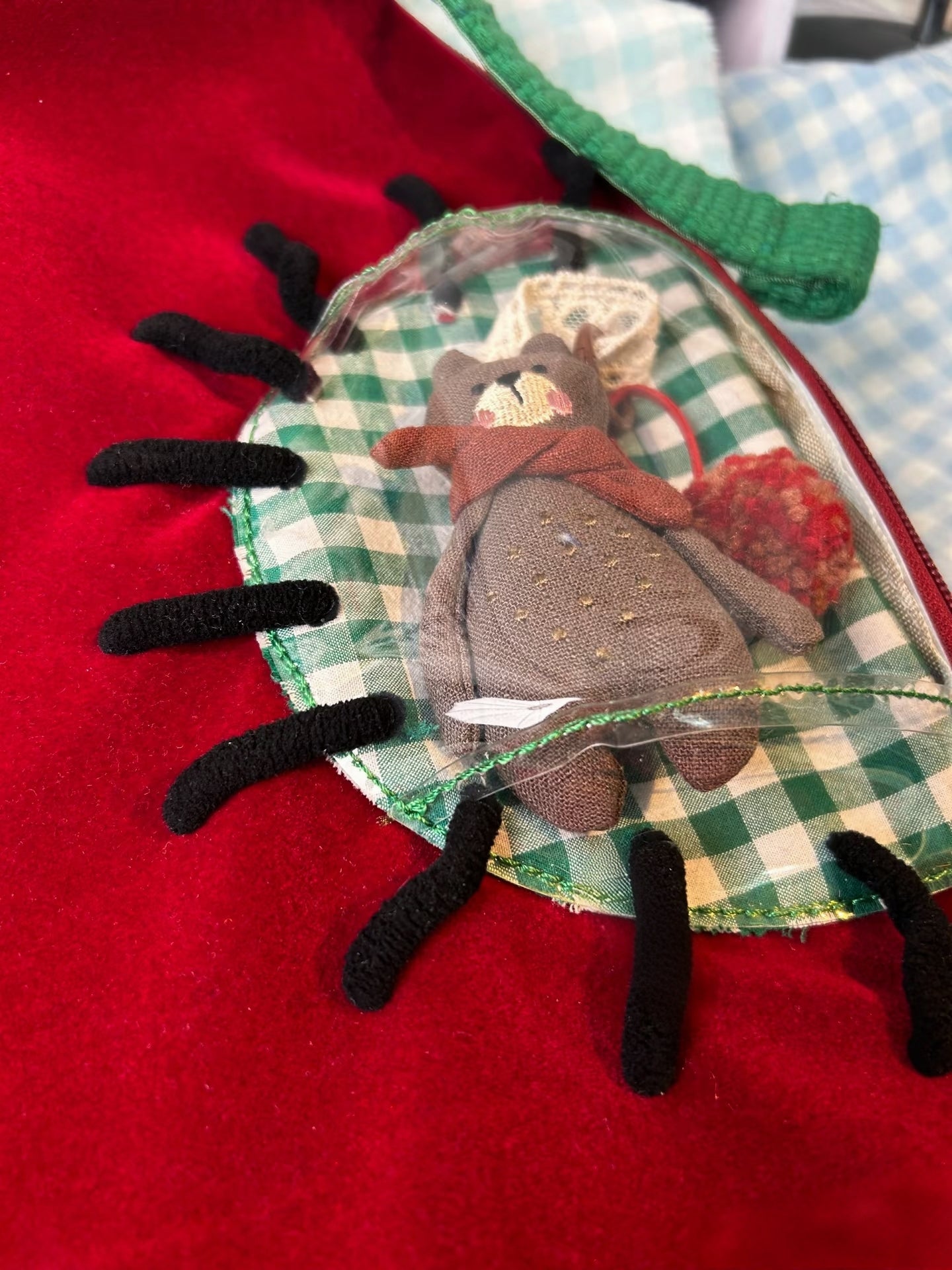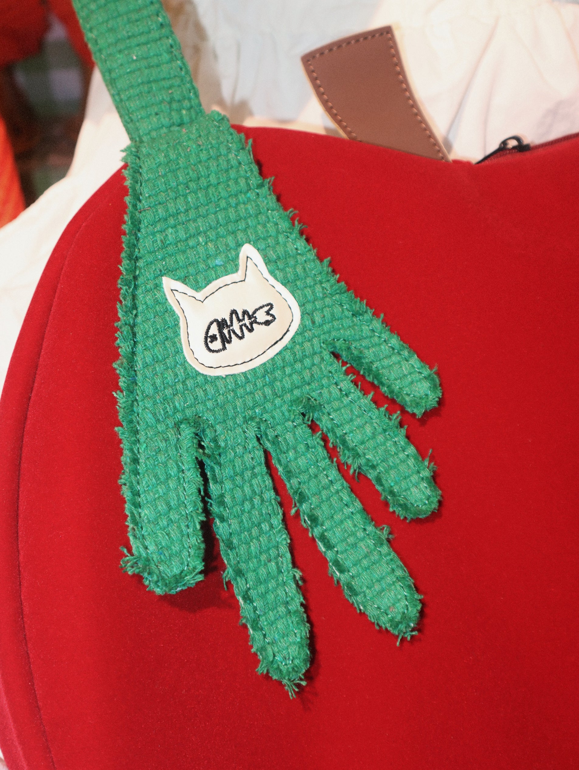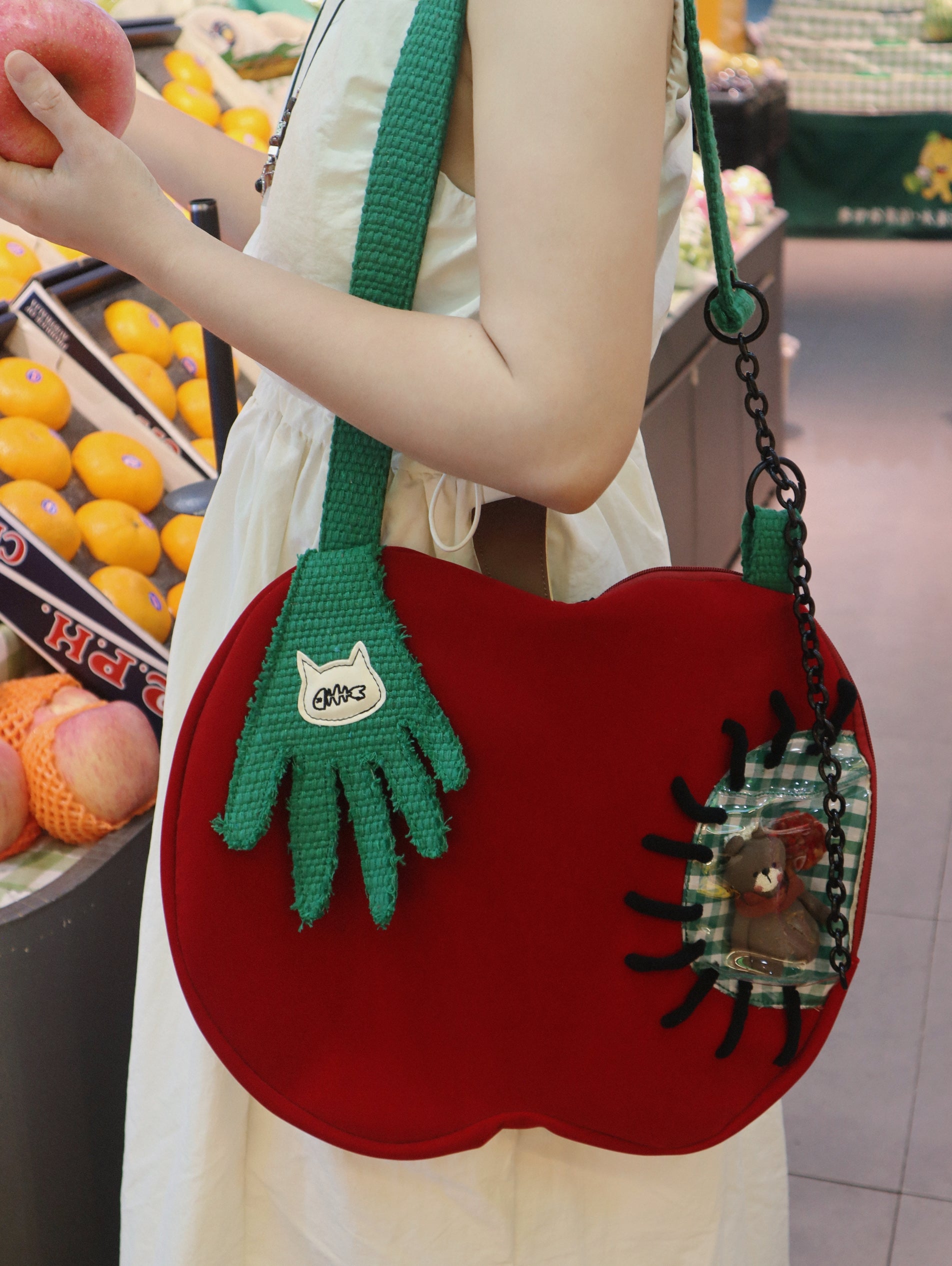 A whimsical Kawaii crossbody bag from One Fish inspired by playful apple and hand motifs.
